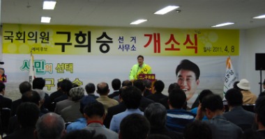 4·27순천국회의원보궐선거에서 출마한 구희승(48) 예비후보가 8일 오후 3시 순천시 조례동 선거사무소에서 수백명의 지지자들이 참석한 가운데 개소식을 개최하고 “순천시민을 위해 일을 할 수 있는 기회를 달라”며 지지를 호소했다.