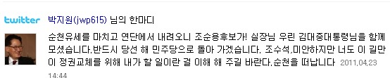 그러나 성공의 기쁨도 잠시, 박지원 원내대표는 본인 트위터를 통해 "순천유세를 마치고 연단에서 내려오니 조순용후보가! 실장님 우린 김대중 대통령님을 함께 모셨습니다.반드시 당선 해 민주당으로 돌아 가겠습니다. 조수석,미안하지만 너도 이 길만이 정권교체를 위해 내가 할 일이란 걸 이해 해 주길 바란다.순천을 떠납니다." 라는 말을 남겼다.