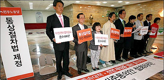 한-EU FTA를 둘러싸고 민주당이 한나라당과의 합의과정에서 민노당과 정책연대를 파기하고 한나라당과 합의했다는 이유로 민노당 다른 의원들과 함께 국회 로텐더홀에서 데모를 하고 있기 때문이다.
