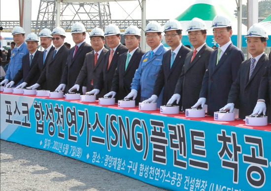 7일 국내 최초 합성천연가스(SNG, Synthetic Natural Gas) 플랜트 설비 착공식 현장에 참석한 포스코 정준양 회장이 이같이 밝혔다.