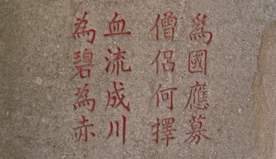 다음은 정유재란 당시 순국한 석주관 칠의사(七義士) 묘역 우측에 세워진 “정유전망의병추념비(丁酉戰亡義兵追念碑)” 후면에 글을 새기고 붉은 경면주사(鏡面朱沙)를 넣어 의병들의 단심(搗)을 전한 명(銘)이다.