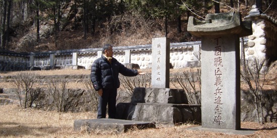 석주관 칠의사 묘역 “정유전망의병추념비(丁酉戰亡義兵追念碑)” 1805년(순조 4) 나라에서는 7의사에게 각각 관직을 추증하였고, 1946년에는 지방 인사들이 칠의각(七義閣)을 짓고 영모정(永慕亭)도 지어서 기념하기에 이르렀지만, 2009년 3월 7일 자료사진을 촬영하기 위해 구례읍 조휴봉 선생과 함께 찾아본 오후의 석주관은 찾는 이 하나 없는 잊혀져버린 슬픈 땅이었다. 혈류성천(血流成川)으로 대변되는 명문은 추념비 후면에 새겨져 있다.