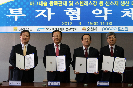 광양만권경제자유구역청 최종만 청장은 지난 15일, 박준영 전남도지사, 서복남 순천시장권한대행 등 40여명이 참석한 가운데, (주)포스코, (주)신승특수강과 순천 해룡산단에 1,927억원 규모의 투자협약을 체결했다. 이번 투자협약으로 375명의 고용효과와 광양만권 지역경제 활성화에도 크게 기여할 것으로 예상된다.