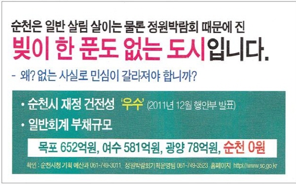 순천시 '재정악화설' 흘려 국회의원 선거에서 재미볼려는 세력은?