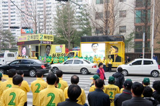 순천 총선에 출마한 민주당 노관규 후보가 29일 첫 유세가 시작된 순천시 연향동 일대 상가를 돌며 시장상인들과 만나고 있다. 노관규 후보는 이날 유세에서 순천정원박람회 성공개최를 위해 이번 선거에서 노관규를 지지해달라고 호소했다. 노관규 후보는 최근 <광주일보>와 <광주방송> 여론조사 결과, 통진당 김선동 후보를 제치고 여전히 1위 자리를 지키고 있다.