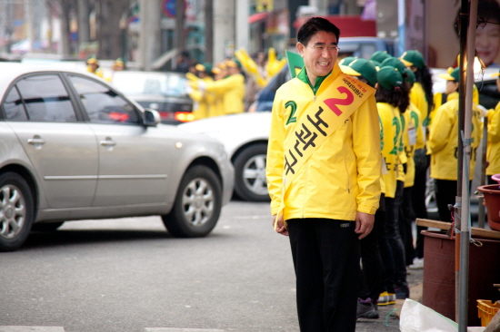 순천 총선에 출마한 민주당 노관규 후보가 29일 첫 유세가 시작된 순천시 연향동 일대 상가를 돌며 시장상인들과 만나고 있다. 노관규 후보는 이날 유세에서 순천정원박람회 성공개최를 위해 이번 선거에서 노관규를 지지해달라고 호소했다. 노관규 후보는 최근 <광주일보>와 <광주방송> 여론조사 결과, 통진당 김선동 후보를 제치고 여전히 1위 자리를 지키고 있다.