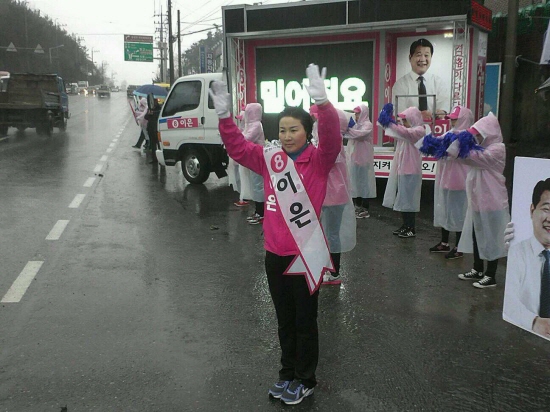 순천시장에 출마한 무소속 이은 후보의 배우자인 김형숙(56)씨가 30일 비가 오는 가운데 순천시민들에게 지지를 호소하고 있다. 봄비가 촉촉히 내린 순천시 연향동 호반아파트 유세현장에 나선 김 씨는 오가는 차량들을 상대로 이번에는 이은 후보를 순천시장으로 당선시켜 달라고 당부했다.