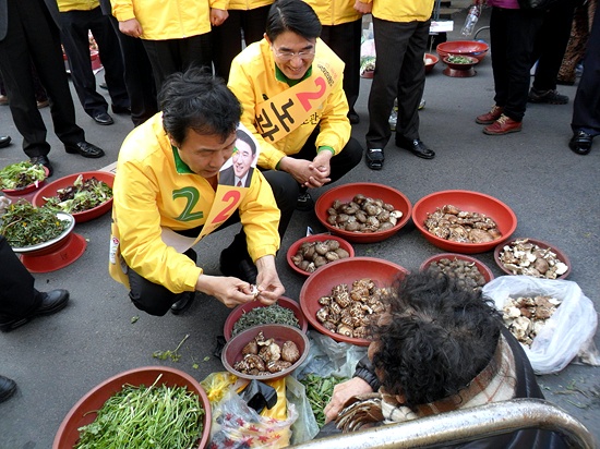 광주 광산갑에 출마한 민주당 김동철 후보와 같이 순천을 찾은 손 고문은 순천 북부시장 노점상을 돌며 야채를 구매하는 등 노 후보 지지활동에 적극 나섰다.