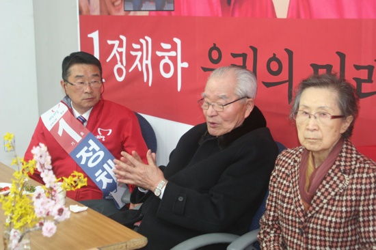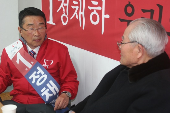순천·곡성 선거구에 출마한 새누리당 정채하 후보가 6일 오후 7시경 고향인 곡성읍에서 부친 정래혁 전 국회의장과 조우했다.