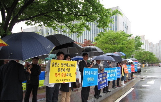 이들은 지난 26일 광주지검 순천지청 앞에서 기자회견을 열고 "친인척을 모조리 계좌 추적하는 먼지털이식 수사로 교육감이 희생 당했다"며 "장 교육감을 석방하라"고 촉구했다.