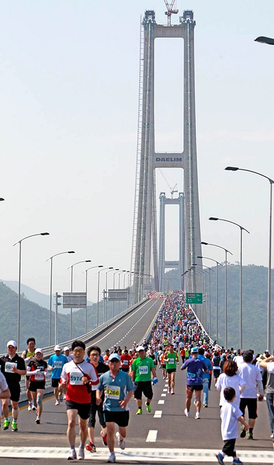 자동차전용도로인 이순신대교를 통과하는 코스로 열린 이번 이순신마라톤대회는 평생 한 번밖에 없는 유일한 대회로 풀코스와 하프코스, 10km, 5km의 종목으로 펼쳐졌다.