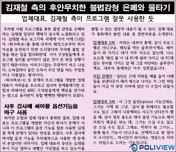 노조는 이어 “하지만 조합과 업체 대표가 통화한 결과, 업체 대표는 프로그램을 개발한 자신의 회사가 문제가 아니라 이 프로그램의 옵션 기능을 잘못 사용한 김재철 측에 문제가 있다는 반응을 보였다”면서 “사후 감사에 써야할 옵션 기능을 무차별적으로 사용한 게 문제의 본질이란 의미”라고 말했다.