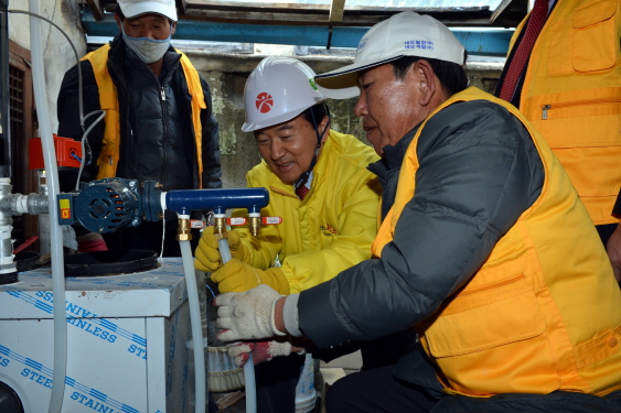 강운태 시장은 오늘 대한전문건설협회 광주시회 회원 등 40여 명의 자원봉사자와 함께 광산구 관내 김모(76, 여)씨 댁을 찾아 연탄보일러 설치, 난방배관, 창문 설치 등에 직접 참여했다.