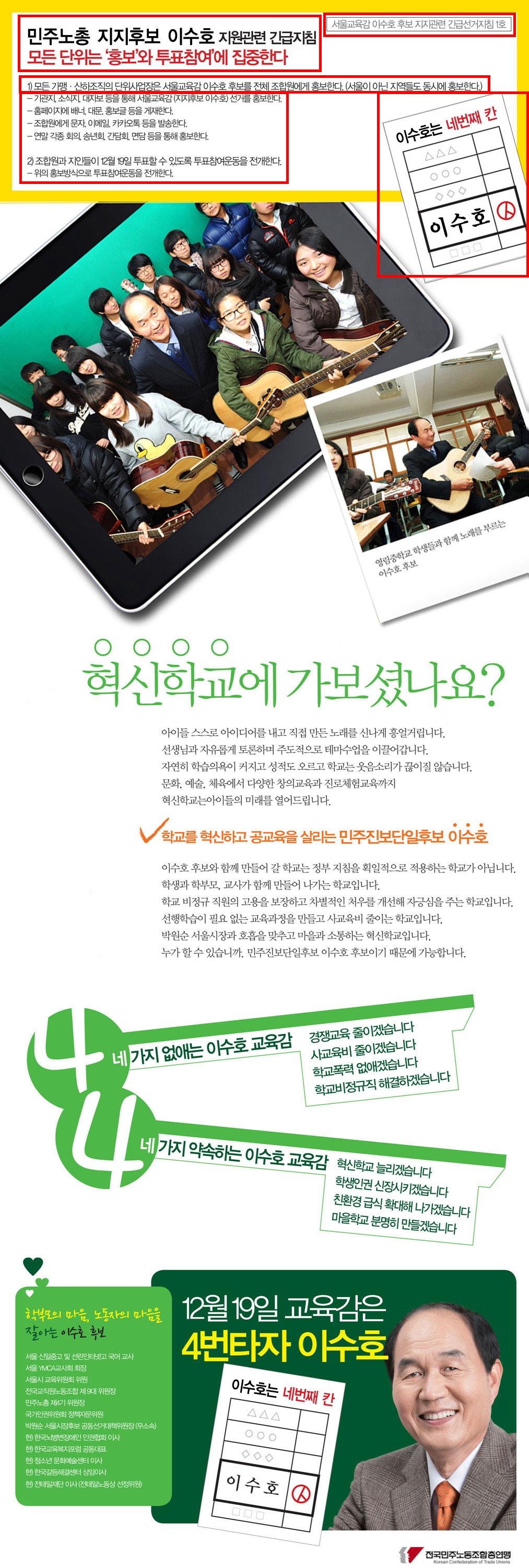 그 때를 지켜봤던 30-40대들은 전교조 위원장 출신 이수호 교육감 후보에게 많은 표를 던졌다. 그러나 전교조는 1999년 합법화 이후 정치·이념적인 활동에 몰두했다. 교육행정정보시스템 반대 투쟁, 학생 버리고 연가 투쟁, 이라크 전쟁 파병 반대 투쟁, 빨치산 추모제에 학생 동원, 광우병 촛불폭동에 학생동원, 민노당 파업투쟁 동참, 교육과 관련 없는 시국선언, 학업성취도평가 거부, 전교조교육감 후보 불법선거운동, 민노당 가입 등등 학생 수업지도를 소홀하여 아이들을 사교육시장으로 내몰았다.