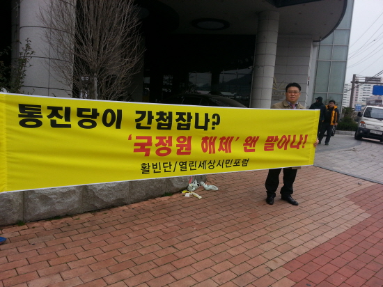 활빈단(대표 홍정식)과 열린세상시민포럼 회원들이 19일 오후 순천 에코그다드호텔 앞에서 "통진당이 간첩잡나? 국정원 해체 왠 말이냐" 라는 구호가 적힌 현수막을 들고 통진당 규탄 시위를 했다. 이들은 조례4거리 시위에 이어 순천조례 호수공원에서도 잇단 시위를 벌였다.