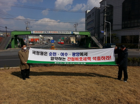 시민단체 활빈단(대표 홍정식)과 열린세상시민포럼은 20일 광양읍 로터리와 순천조례 4거리에서 "순천· 광양· 여수에서 암약하는 간첩비호세력 색출하라!"는 구호가 적힌 현수막을 들고 시위행사를 가졌다. 이들은 통진당 출마자들이 국정원 증거조작 의혹 사건과 관련, "서울시 공무원 간첩사건 당사자인 유우성의 수상한 행각에 대해선 침묵한 채 국정원 해체만을 주장하고 심지어 '내란음모 이석기 RO 사건'도 조작사건으로 은근슬쩍 넘어가려한다"며 통진당을 강력 규탄했다.