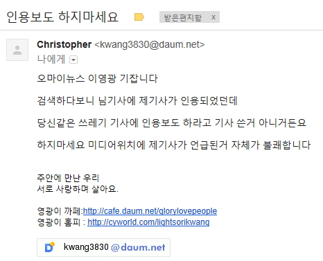 관련 기사 <오마이뉴스 기자 “쓰레기 기사에 내 기사 인용 하지마”> http://poliview.co.kr/detail.php?number=8627&thread=22