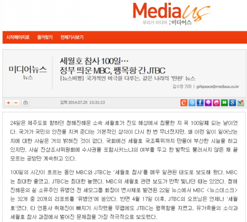 미디어스는 25일 <세월호 참사 100일… 정부 띄운 MBC, 팽목항 간 JTBC>란 제하의 기사에서 MBC에 대해선 비판, JTBC에 대해서 칭찬으로 일관했다. 기사는 “100일의 시간이 흐르는 동안 MBC와 JTBC는 ‘세월호 참사’를 매우 일관된 태도로 보도해 왔다. MBC는 최대한 줄였고, JTBC는 최대한 늘렸다”면서 “MBC의 세월호 관련 보도가 반짝 빛나던 때는 있었다. 청해진해운의 실 소유주인 유병언 전 세모그룹 회장이 변사체로 발견된 22일 뉴스에서 MBC <뉴스데스크>는 32개 중 20개의 리포트를 ‘유병언’에 쏟았다.”고 지적했다.