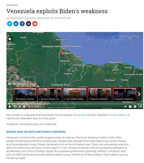 사설은 니콜라스 마두로가 베네수엘라 국민을 빈곤하게 만드는 데 만족하지 않고 악의적인 새 목표를 설정했다고 비판하면서 석유 매장량이 많은 인접국 가이아나가 그 대상이 되었다고 설명했다.