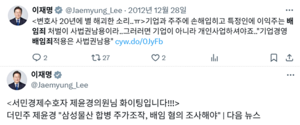 이 글에서 이 대통령은 ‘기업경영 배임죄 적용은 사법권 남용’이라는 게시물을 인용하며 “기업과 주주에 손해입히고 특정인에게 이익 주는 배임죄 처벌이 사법권남용이라.. 그러면 기업이 아니라 개인사업 하셔야죠”라고 비판했다.