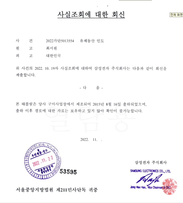 그런데, ‘이 사건 태블릿’의 반환에 관한 재판에서 이루어진 삼성전자의 사실조회 회신 등에 따르면, ‘이 사건 태블릿’은 2015. 8. 16.에 출하되어, 18일부터 9월 9일까지 사용되었다.
