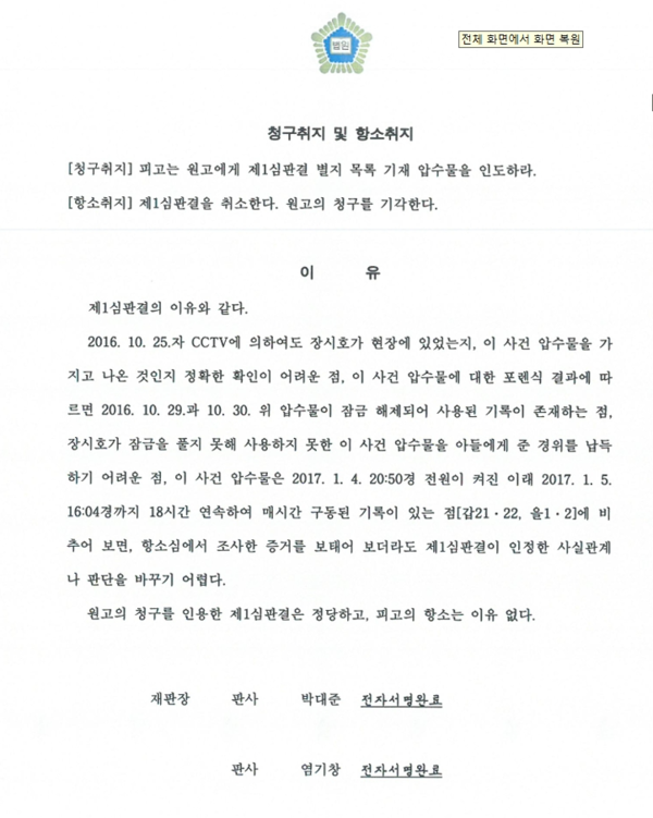 최서원의 한동훈 특검이 조작한 태블릿 관련 반환소송 2심에서 서울중앙지법 5-1 민사부 사실상 장시호의 거짓말로 인한 태블릿 조작을 인정하는 판결문을 발표했다.