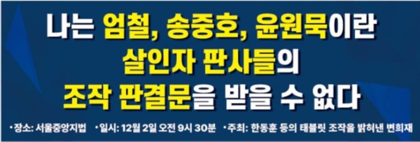 12월 2일, 서울중앙지법 항소4-2부의 엄철, 윤원묵, 송중호 판사의 태블릿 조작 범죄를 은폐하려는 만행과 폭거에 항거, 황의원 전 대표가 자결을 한 상황에서, 변희재 대표는 고인의 유지를 따라, 선고기일 불참을 선언한 바 있다. 그 대신 오전 9시 30분, 신혜식 대표, 오영국 대표, 주옥순 대표, 정유라씨 등과, 재판부를 규탄하는 기자회견을 열 계획이다.
