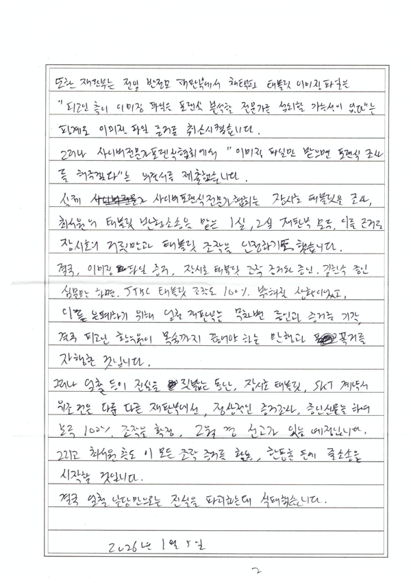 또한 재판부는 전임 반정모 재판부에서 채택된 태블릿 이미징 파일을 “피고인 측이 이미징 파일을 포렌식 분석할 전문가를 섭외할 가능성이 없다”는 핑계로 이미징 파일 증거를 취소시켰습니다. 그러나 사이버포렌식전문가협회에서 “이미징 파일만 받으면 포렌식 조사를 해주겠다”는 의견서를 제출했습니다. 실제 사이버포렌식전문가협회는 장시호 태블릿을 조사, 최서원의 태블릿 반환소송을 맡은 1심, 2심 재판부 모두, 이를 근거로 장시호의 거짓말과 태블릿 조작을 인정하기도 했습니다.