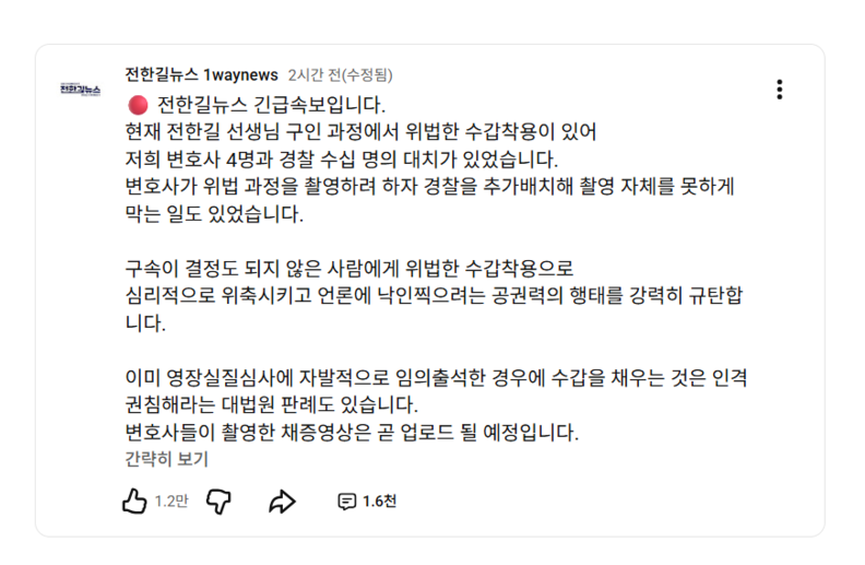 전 씨 측 변호인단은 유튜브 채널 <전한길뉴스> 게시글을 통해 “구인 과정에서 위법한 수갑 착용이 있었고, 변호사 4명과 경찰 수십 명이 대치하는 상황이 벌어졌다”고 밝혔다.