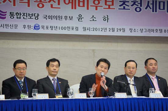 <데일리안광주전라>와 목포시민신문의 공동주최로 목포지역 국회의원 선거 예비후보 4인 초청 세미나가 성황리에 진행되고 있는 가운데 세 번째 초청후보로 30년 동안 학생운동과 시민사회운동가로 잔뼈가 굵어진 윤소하 통합진보당 목포지역 국회의원 후보가 초청됐다.