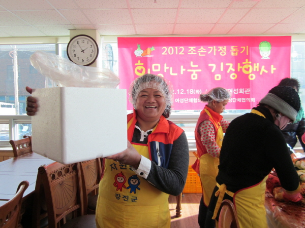 강진군여성단체협의회 회원 30명은 강진읍 노인복지관에서 손수 담군 김장김치 8kg과 백미(20kg) 1포대씩을 읍.면에 거주하는 조손가정 72가구에 전달해 따뜻한 겨울나기를 실천했다.