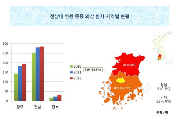 지역별로는 전남지역 환자가 819명(57.7%), 광주 519명(36.3%), 전북 70명(4.8%)이었으며, 경남 등 타 지역 환자도 늘고 있어 전남대병원 중증외상센터에 대한 신뢰와 의존도가 높아가고 있는 것으로 나타났다.