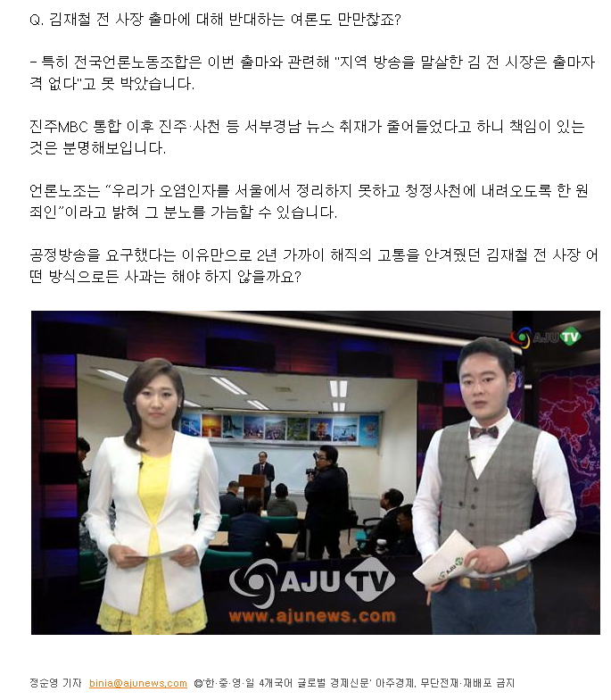 특히 아주경제TV의 경우 '김재철 사천시장 출마에 언론노조 “사천 물 오염시켜 죄송”'이란 악의적 제목을 뽑았다. 해당 기사에서 진행자들은 “김재철 전 사장 출마에 대해 반대하는 여론도 만만찮죠?”라면서 이후 언론노조의 주장을 전달했다.