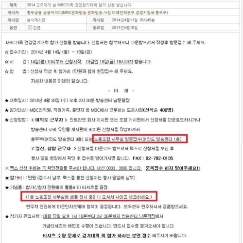 예정된 <2014년 근로자의 날 MBC가족 건강걷기대회>가 MBC본부노조를 주축으로 신청접수가 이뤄지고 있어 내부적으로 "해도 해도 너무한다"는 불만이 터져 나오고 있는 것.