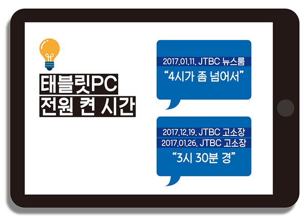 태블릿PC를 처음 켠 것과 관련하여 JTBC는 장소에 이어 왜 시간에 대해서도 방송과 다르게 말을 바꿔야만 했을까. 이는 JTBC가 이전에 공개했던 태블릿PC 구동화면 문제와 관계있다.