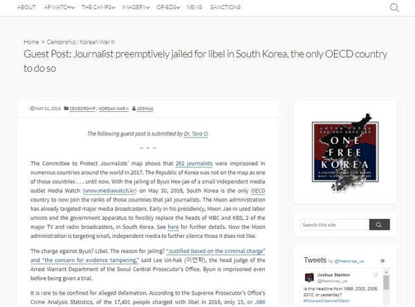 미국의 대표적인 북한 인권 관련 블로그인 원 프리코리아(One Free Korea)가 변희재 미디어워치 대표고문의 구속 사건을 다루며 한국 종북좌파 정권의 언론 탄압 정치를 비판하고 나섰다.