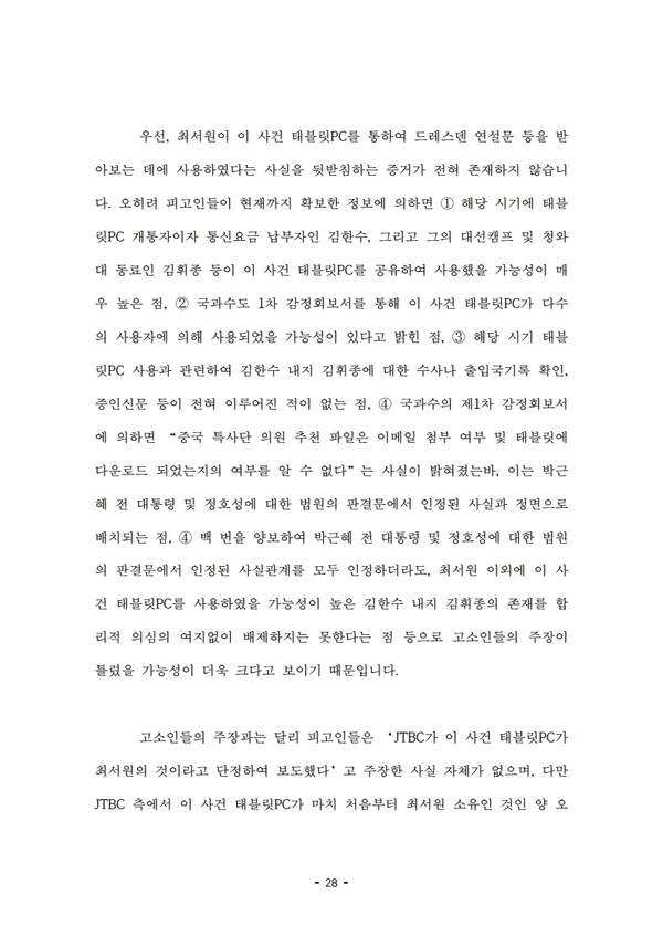 또 “JTBC의 태블릿PC 보도는 국가적 수준에서 큰 파급효과를 가져온 보도이고 따라서 이 보도가 공정하고 객관적이었는지, 그리고 무엇보다도 진실했는지에 대한 검증은 치열해야 할 수 밖에 없다”며 “본 재판은 그런 검증의 연장선상에서 단순히 명예훼손 유무죄 여부를 떠나서 대한민국 역사에 남는 중요한 기록이라고 할 것”이라고 단언했다.