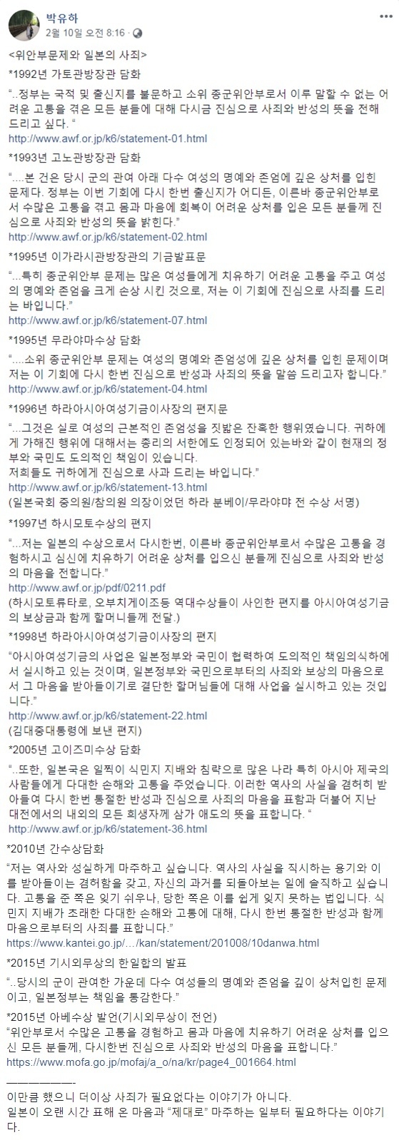 박 교수는 이러한 일본의 사죄 역사를 전하면서 “이만큼 했으니 더이상 사죄가 필요없다는 이야기가 아니다”며 “일본이 오랜 시간 표해 온 마음과 ‘제대로’ 마주하는 일부터 필요하다는 이야기“라고 말했다.