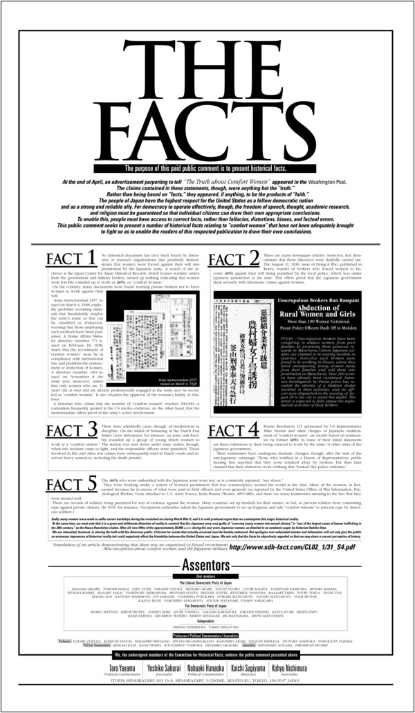 야야마 타로(屋山太郎)•사쿠라이 요시코(櫻井よしこ)•하나오카 노부아키(花岡信昭)•스기야마 고이치(すぎやまこういち)•니시무라 코유(西村幸祐) 보수 논단 5명으로 구성된 ‘역사사실위원회(歴史事実委員会)’는, ‘워싱턴포스트’ 2007년 6월 14일자에 ‘THE FACTS’라는 제목으로 의견 광고를 냈다.
