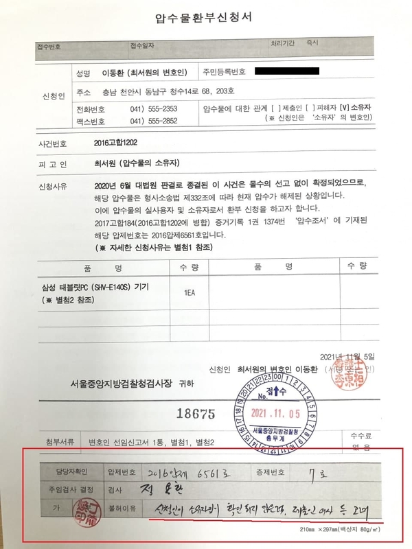하지만 서울중앙지검(정용환 검사)은 “신청인(최서원)이 소유자임이 확인되지 않는다”는 사유를 들어 11일 불허 결정을 통보했다. 이날 정용환 검사는 이동환 변호사와의 통화에서 “수사팀에 확인한 결과 최서원은 태블릿을 사용한 것이지, 소유자는 아니라고 판단했다”고 답했다.