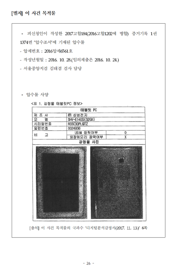 또한 검찰은 태블릿을 압수한 뒤 2016년 10월 25일 사본화파일(이미징파일)을 만들어 포렌식을 했다. 형사소송법 제218조의2 제1항에서는 “검사가 사본을 확보한 경우 등 압수를 계속할 필요가 없다고 인정되는 압수물에 대하여 소유자·소지자·보관자 또는 제출인의 청구가 있는 때에는 환부하여야 한다”고 정하고 있다.