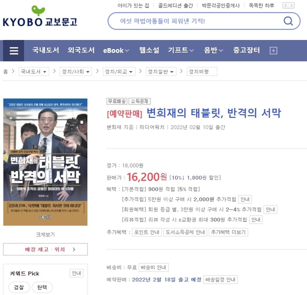 미디어워치 편집부는 신간 ‘변희재의 태블릿, 반격의 서막’의 예약판매가 13일부터 교보문고, 예스24, 알라딘 등 온라인 서점에서 동시에 시작됐다고 밝혔다. 13일 현재 인쇄소에서 초판 물량을 출력 중이며, 오프라인 서점에서는 오는 18일부터 구입 가능하다.