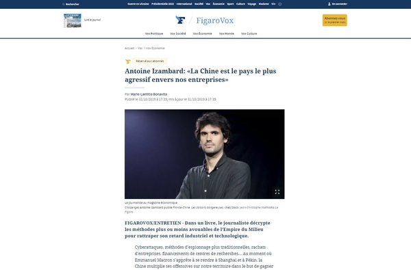 ※ 본 인터뷰 기사는 프랑스의 세계적 유력지 ‘르 피가로(Le Figaro)’의 마리-라에티시아 보나비타(Marie-Laetitia Bonavita) 기자가 ‘프랑스와 중국의 위험한 관계’의 저자인 앙투안 이장바르를 인터뷰하여 ‘앙투안 이장바르, “중국은 프랑스 기업들에 가장 공격적인 국가”(Antoine Izambard: «La Chine est le pays le plus agressif envers nos entreprises»)’ 제하로 2019년 10월 31일에 공개한 것입니다. ‘르 피가로’로부터는 번역 전재 허락을 받았습니다. (번역 : 황지현)