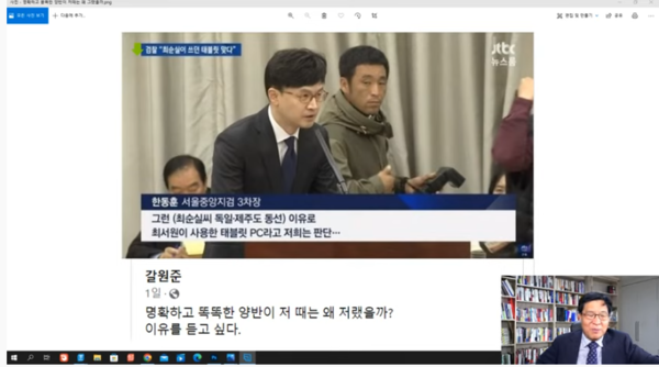 28일, 이 전 기자는 자신의 유튜브 채널 ‘카메라 출동’을 통해 한동훈 법무부 장관이 서울중앙지검 3차장 당시 국회 국정감사 현장에서 “최서원이 사용한 태블릿이라고 저희는 판단...”이라고 발언한 장면을 보여주며 이같이 지적했다.