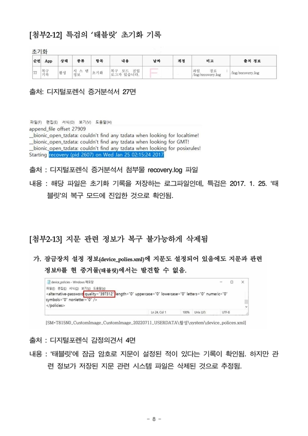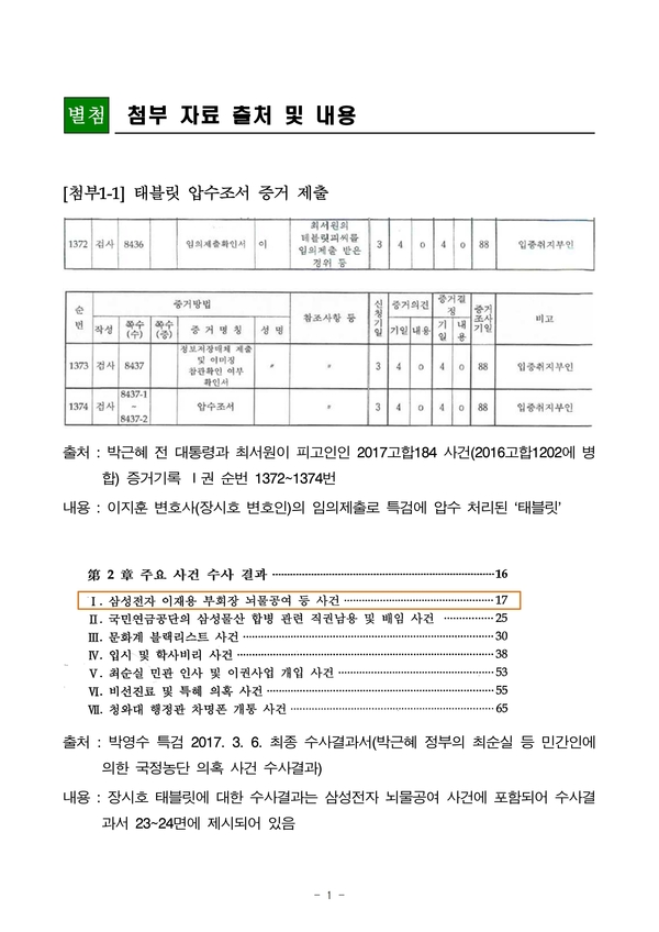 [편집자주] 본 기사는 최서원 씨 법률대리인 이동환 변호사의 ‘박영수 특검팀이 수사한 장시호 제출 ‘제2태블릿’ 포렌식 검증 결과 발표 기자회견‘(2022년 11월 29일)에서 공개된 보도자료 별첨 자료의 전문을 포함하고 있습니다.