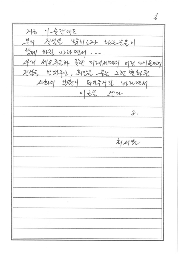 변론 진술서 법원에서 최서원에게 제1태블릿PC와 제2태블릿PC를 돌라주라는 반환소송에서 1심에서 모두 승소했지만 대한민국 측 법률상 대표자인 한동훈 장관 명의로 항소를 제기했다. 이것은 본인들 스스로 특검에서 내것(최서원)이라 우기며 국정농단을 정당화했던 것을 부정하는 것이나 마찬가지이다. 법무부의 수장인 한 장관이 얼마나 급했으면 장시호가 제출했던 제2태블릿PC 반환을 보류해달라며 강제집행 정지 신청을 했는지 국민들은 이미 다 알고 있을 것이다. 이미 장시호가 제출한 태블릿은 여기저기 은폐, 조작 증거가 나왔고, CCTV 영상에 장시호가 들고 나왔다는 영상이 있다고 우겨대던 특검이 그걸 내놓지도 못하고, 재판에 불복하면서 항소를 제기한 것 자체가 말이 안되는 것이다. JTBC가 공개했던 제1태블릿은 문서 기능조차 없는 것임에도 불구하고 내가 들고다니면서 문서를 수정했다는 증인까지 꿰맞춰 수사를 해놓고 이제와서 최서원에게 반환할 수 없다는 코미디 같은 항소에 대해 앞으로 어떤 근거를 대나갈지 지켜 볼 일이다. 한 가족과, 한 나라 여성 대통령을 태블릿PC를 근거로 멸살시키고 탄핵시킨 단초 역할을 했던 이 사건은 반드시 진실을 밝혀야 할 것이고, 반드시 밝혀질 것이다. 박영수 특검이 앞에서는 정의를 말하며 영웅처럼 국민에게 다가가며 뒤에서는 화천대유 등 온갖 비리를 저지르며 국민을 속였다는 자체가 더 충격적이다. 박영수 특검이 비리에 연루되어 있으면서도 나와 전혀 인척관계도 아닌 이 나라의 최고 권력자인 여성 최초 대통령인 박근혜 대통령과 아무 직책도 없었던 민간인인 나를 엮어 경제 공동체로 만들어 뇌물죄를 씌워 재산을 몽땅 빼앗은 것과 태블릿PC를 조작한 것은 역사의 오점으로 반드시 기록될 것이다. 박 전 대통령과 무슨 원한이 있길래 그렇게 무모하리만큼 비열하게, 잔인하게 몰아붙였는지 모르지만, 박 대통이 말씀하신 시간이 흐르면 진실은 밝혀질 것이라는 그 신념 자체가 반드시 이길 것이다. 며칠 전에 딸 유라가 찾아와서 7년 세월을 아무도 없이 세 아이들과 엄마만 기다려왔는데 이제는 더 버틸힘도, 살기도 싫다며 아이들 데리고 죽고 싶다는 청천벽력 같은 말에 가슴이 매맞는 것 같이 아려왔다. 20대 젊은 청춘의 삶을 빼앗아간 비난과 욕설속에서도 버텨왔던 딸의 절망과 애타게 기다린다는 세 손주들의 기다림에도 냉혹한 이 사회가 보여준 무관심에 그 아이들의 삶이 어떻게 나락에 떨어지려는지 가늠할 수가 없음이다. 태블릿의 진실이 밝혀질까봐 두려운가 보다. 지금 이 시점에서 영원히 나를 감옥에 묶어놓는다고 해도 태블릿PC의 진실은 감출수도 감춰지지도 않을 것이다. 비겁하게 진실앞에서도 침묵하고 가리려 하는 이들이 현존하고 있음에도 반드시 진실은 빛을 찾아갈 것이다. 나는 그 길에 서서 딸과 세 손주들의 삶이 떳떳하게 살아갈수 있도록 죽이면 죽을 각오로 임할 것이다. 부디 딸 유라도 엄마의 짐을 내려놓고 절대 나쁜 선택을 하지말길 간절히 바라고 싶다. 이 사회가 무서운 침묵으로 비난으로 아이들의 삶을 절벽으로 밀어버린다면 이 나라가 떠안아야 할 비극인 것이다. 2016년 12월 24일 삼족을 멸하고 딸 아이를 체포하여 감옥에 쳐넣겠다던 신자용 당시 특검 검사가 이번에 사면위원회 심사위원이 된 것도 다시한번 그 당시 악몽을 떠올리게 했다. 2022년 8월경 그를 고소했고 독직폭행에 해당한다고 공수처에 이첩되었는데 공소시효가 얼마 남지 않았는데 고소인 조사조차 이뤄지지 않고 있다. 사건 자체를 권력의 힘으로 봉해 버리는 일이 없길 바란다. 한동훈 장관이 법과 원칙에 따라 모든 걸 수사한다고 했으니 지켜볼 것이다. 나는 인권보호는 바라지도 않지만, 인권유린은 자유민주주의에서 누구에게도 허락되지 않는 것이다. 이 사회에 해악을 끼친 배임‧횡령 등의 경제인들과 전직 대통령들도 사면되었는데 세 번째 사면까지 나만 쏙 빼놓은 것이 신분차별인지 괘씸죄인지 묻고 싶다. 나라가 어려울 때마다 흥망을 좌우한건 국민들이었다. 지식인들이 불의에 침묵하고 권력에 굴복하기 시작하면 국가가 어둠의 길을 가는 것이다. 지금 이 순간에도 부디 진실을 밝히고자 하는 분들이 함께 하길 바란면서... 우리 세 손주들과 같은 미래세대의 어린 아이들에게 진실을 알려주고 희망을 주는 그런 변화된 사회의 일원이 되어주시길 바라면서 이 글을 쓴다. 8. 최서원 |