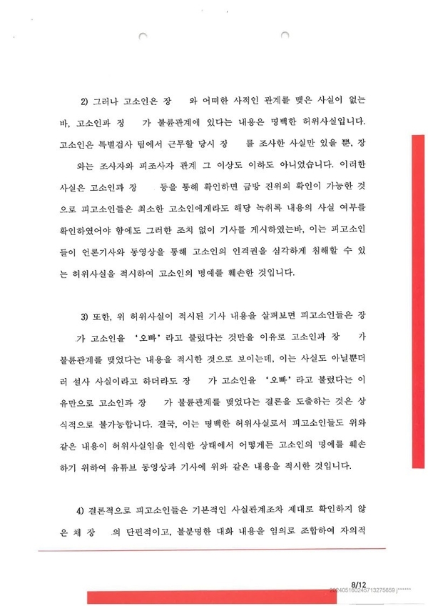 김영철 검사는 고소장에서 장시호 씨와 불륜 관계라는 의혹, 장시호 씨에게 1년 6개월 형량을 미리 알려줬다는 의혹, 장시호 씨의 법정 증언을 연습시켰다는 의혹 등을 모두 허위로 규정했다. 그러나 이를 뒷받침할 증거는 제시하지 않았다. 오히려 고소장은 "피고소인들이 최소한의 사실 확인 절차도 없이 기사를 게시했다"며 언론의 취재 방식을 문제 삼는 데 그쳤다. 김영철 검사는 고소장에서 장시호 씨가 김검사를 '오빠'라고 부른 것만으로 불륜을 단정한 것처럼 주장했지만, 이는 사실과 다르다. 그리고 뉴탐사는 불륜보다 위증교사에 더 무게를 두고 보도중이다. 위증교사는 단순한 개인의 일탈이 아니라 사법정의를 근간에서 뒤흔드는 심각한 범죄행위이기 때문이다.