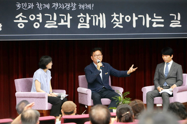 송 대표는 5일 오후 광주 5·18 교육관에서 열린 ‘송영길과 함께 찾아가는 길’ 토크 콘서트에서 “정치검찰들의 지난 행각을 돌이켜볼 때, 검찰의 피해자 코스프레를 어느 국민이 공감하겠는가”라며 “이원석 검찰총장은 그럴 용기가 있으면 김건희 여사부터 하루빨리 포토라인에 세우라”며 검찰의 탄핵 반발을 일축했다.