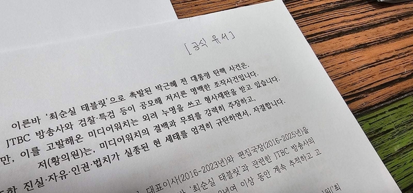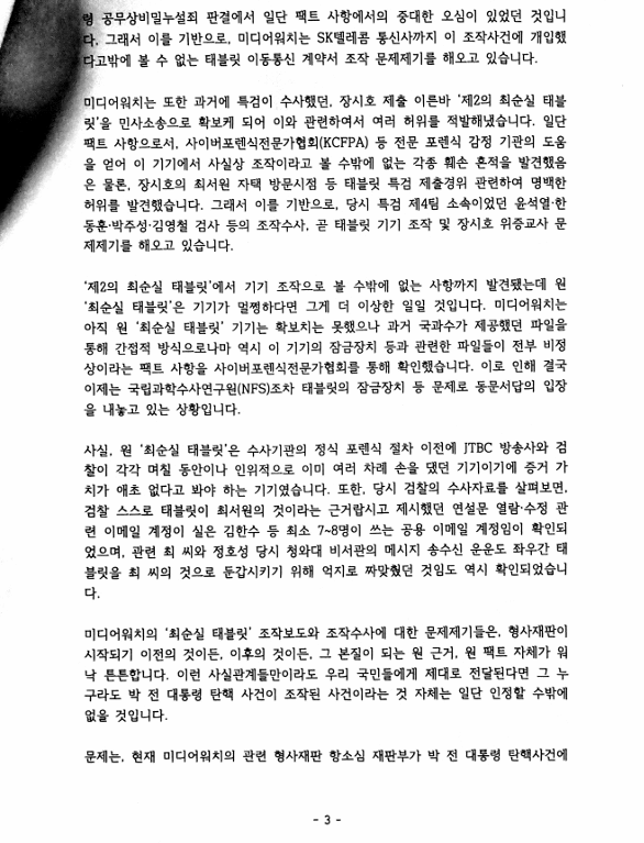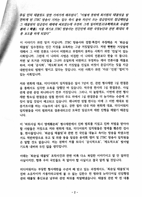 황 전 대표는 “역대 재판부의 횡포로 인해 미디어워치는 지난 7년여 동안 1심부터 항소심까지 원 ‘최순실 태블릿’에 대해서는 아예 기기에 대한 감정조차 정식으로 한번 못해보는, 도무지 말도 안되는 불공정한 형사재판을 받아 왔습니다. 적어도 미디어워치가 엄철 판사와 같은 시정잡배 수준의 판사에 의해 형사재판을 받는 일 만큼은 즉각 중단되어야 할 것”이라 경고했다.