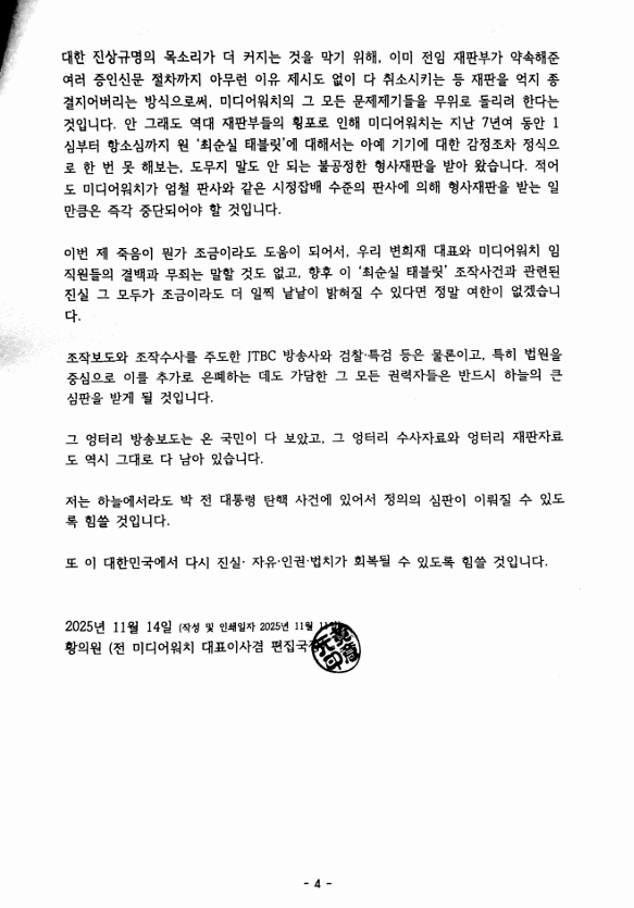 한편 황 전 대표의 장례식은 유족과 미디어워치 측이 상의 서울 인근에서 치러질 계획이다.